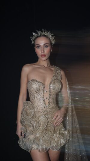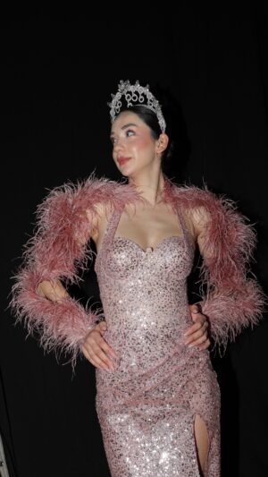 Özel davet, balo ve düğün stiliniz için kristal taş ve tüy detaylı “Glitter Rose Dress”